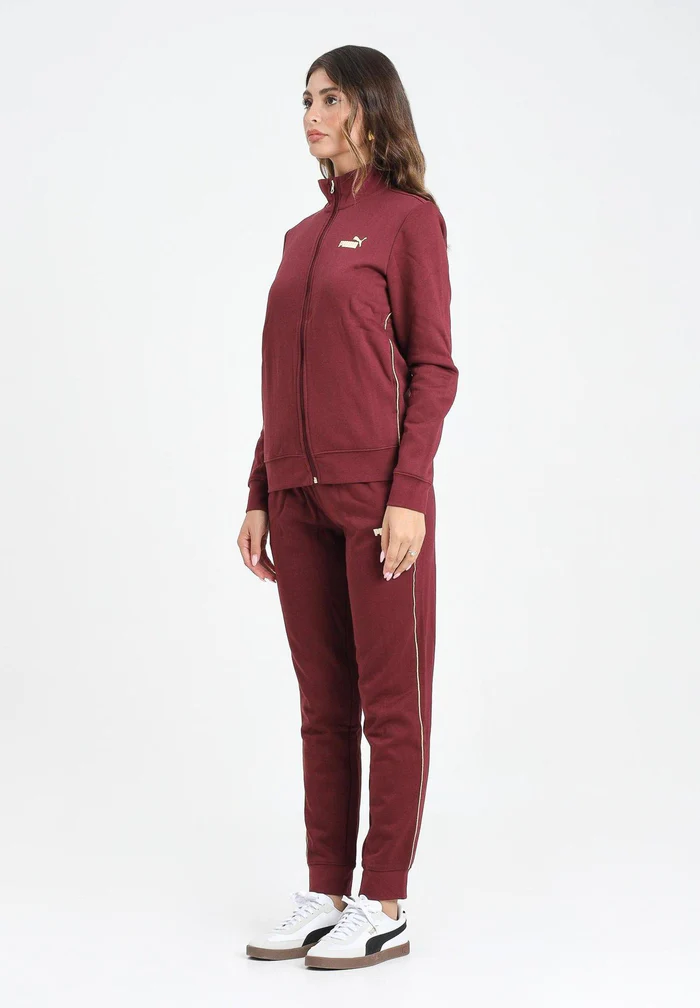 PUMA Tuta Ess + Textured Foil FZ bordeaux da donna. La felpa presenta una linea slim con collo alto, zip a tutta lunghezza e logo PUMA dorato sul petto. Inserti oro lungo i fianchi e maniche per un tocco sofisticato.I pantaloni sono dotati di fascia elastica in vita e polsini alla caviglia, con logo PUMA dorato sulla gamba sinistra e dettaglio a contrasto in oro lungo i lati. Un completo sportivo ma chic, ideale per il tempo libero e lo sport.