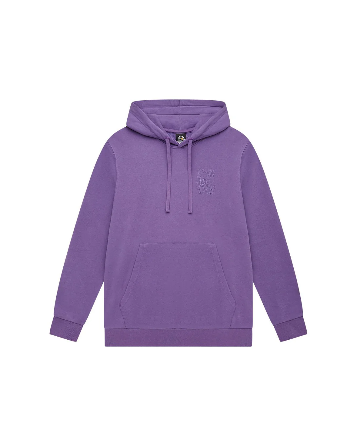 Felpa con cappuccio uomo color viola lavanda. Ampia tasca marsupio frontale. Fondo capo e polsini a coste. Scorpione in rilievo a petto tono su tono.
