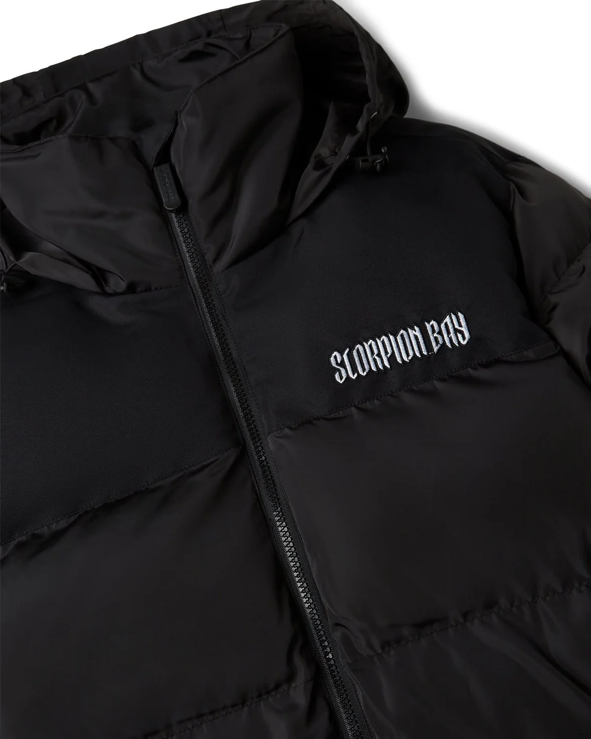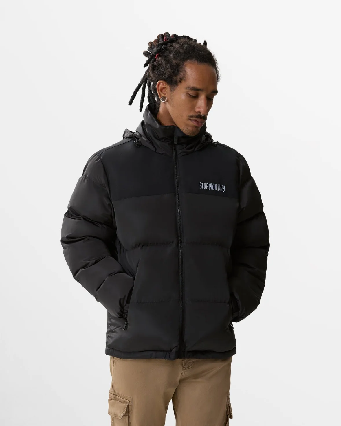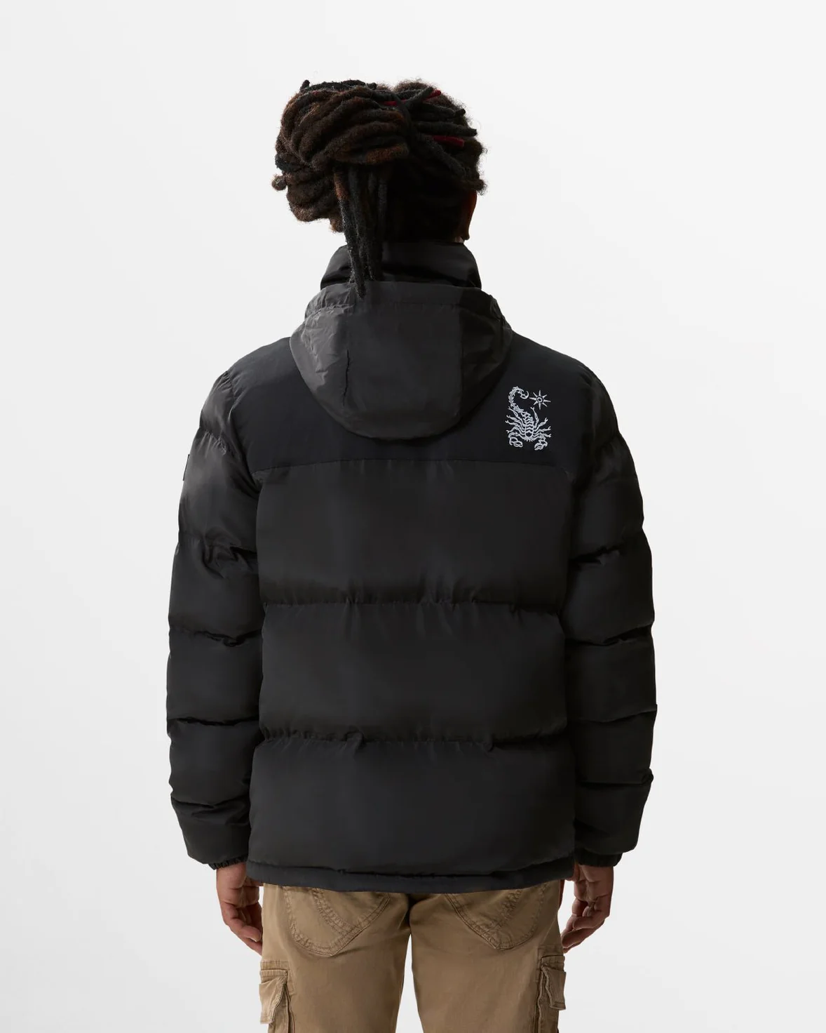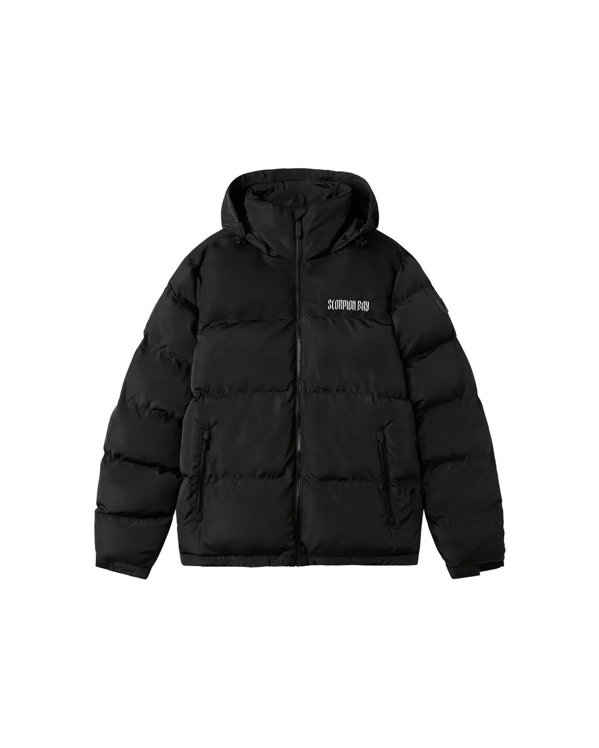 Giacca imbottina uomo color nero. Chiusura con zip. Tasche con zip. Cappuccio estrabile. Ricami decorativi a contrato.